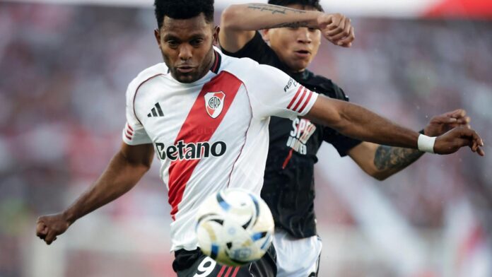 El delantero colombiano del Millonario ganó de cabeza tras un tiro de esquina, pero el arquero de Riestra logró tapar el remate con cierta facilidad.