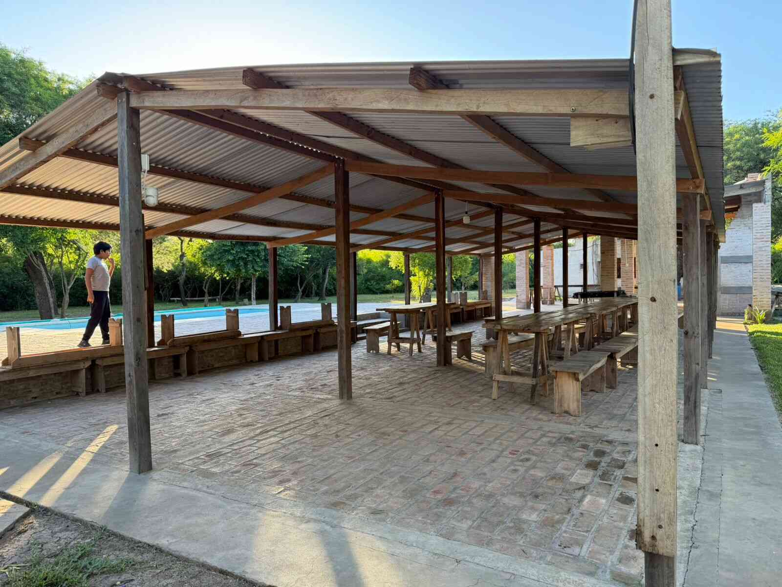 Sector de piletas con parrillero techado y quinchos para eventos.