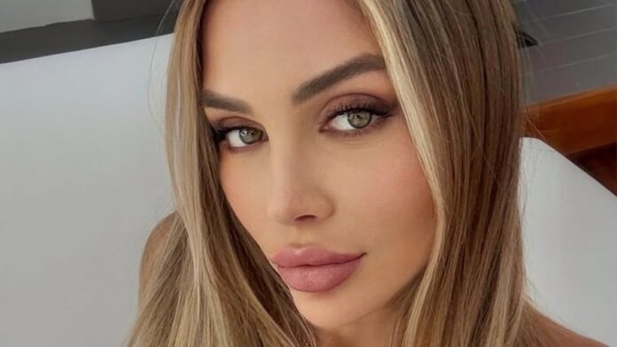En una de las fotos, se mostró en primer plano con un corpiño estilo triángulo en celeste pastel, acompañado por delicados collares dorados en capas finas, con dijes minimalistas que resaltan sobre la piel bronceada. El beauty look está marcado por una base uniforme, labios nude con acabado satinado, cejas bien definidas y una sombra en tonos tierra que realzan su mirada clara, sumado a un delineado sutil y máscara de pestañas que aportan intensidad.