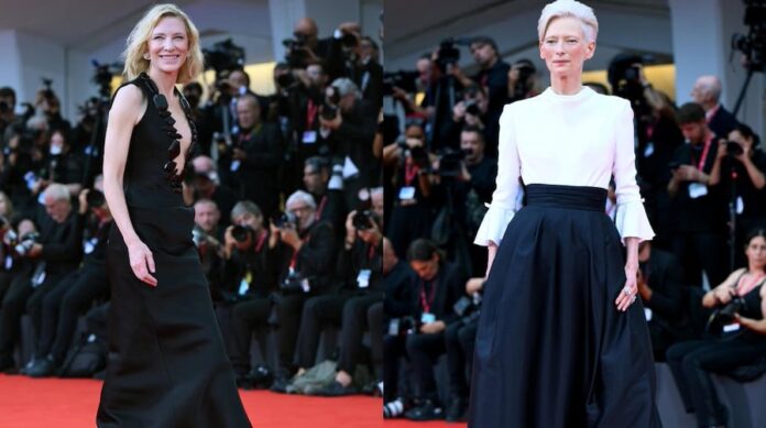 Cate Blanchett llevó un vestido negro escotadísimo, al cuerpo y con detalles de pedrería a juego en el escote. Tilda Swinton, por su parte, eligió una blusa blanca con una falda larga de cintura alta armada negra.