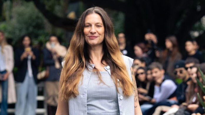 La investigadora se sumó al resto de las modelos que lucieron las nuevas piezas de la propuesta autóctona que reinterpreta la tradición desde una mirada urbana y contemporánea. Lo hizo con un conjunto a rayas celestes y blancas de top, chaleco y pantalón de vestir.