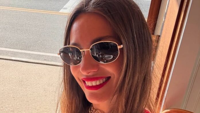 Para complementarlo optó por un par de sandalias negras con plataformas, tobillera y tiras finas y manicura a juego. El pelo lo usó recogido en una cola de caballo bien tirante con ondas y remató con maquillaje en tonos neutros: máscara de pestañas, delineado, rubor en las mejillas y labios rojo suave.