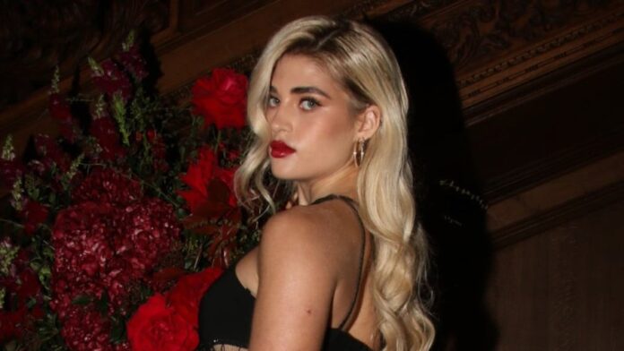 Lola Latorre apostó por un vestido corto de encaje floral translúcido con corset y minifalda voluminosa, estilo balloon, de Camila Romano. El diseño se completó con guantes de encaje al tono y sandalias a juego con plataformas XXL y tobillera con strass.