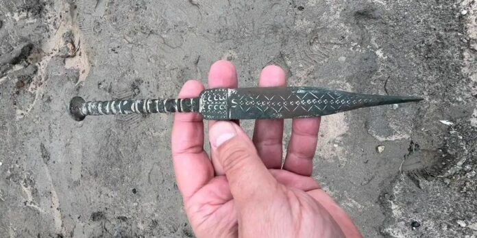 El hallazgo se produjo gracias al esfuerzo de Jacek Ukowski y Katarzyna Herdzik, quienes recurrieron a un detector de metales y descubrieron la daga entre fragmentos de arcilla desprendidos por una tormenta. Como describe National Geographic, posteriormente se realizó un análisis de fluorescencia de rayos X en el Museo Nacional de Szczecin.