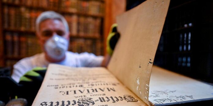 Un restaurador muestra un libroUn restaurador muestra un libro antiguo con agujeros en sus páginas debido a una infestación de escarabajo de farmacia, en la biblioteca de la Abadía de Pannonhalma, Hungría, el jueves 3 de julio de 2025 (Pannonhalma Archabbey via AP)