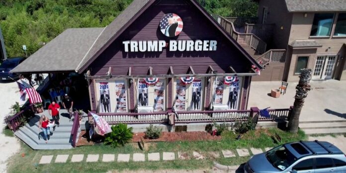 Customers sit at the TrumpCustomers sit at the Trump Burger, Donald Trump-themed restaurant, in Bellville, Texas, U.S. September 7, 2024. REUTERS/Evan Garcia