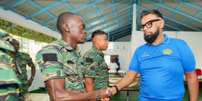 El presidente de Guyana, IrfaanEl presidente de Guyana, Irfaan Ali, saluda a las tropas de la Fuerza de Defensa del país, en la aldea de Anna Regina, en el Esequibo (EFE/ Presidente Irfaan Ali)