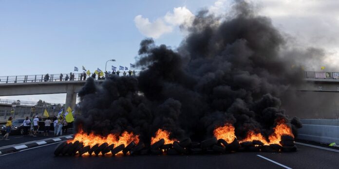 La acción colectiva incluyó cortes de tráfico en arterias clave, quema de neumáticos en intersecciones y manifestaciones frente a las residencias de ministros del gobierno, según imágenes difundidas por grupos prodemocracia israelíes en redes sociales.