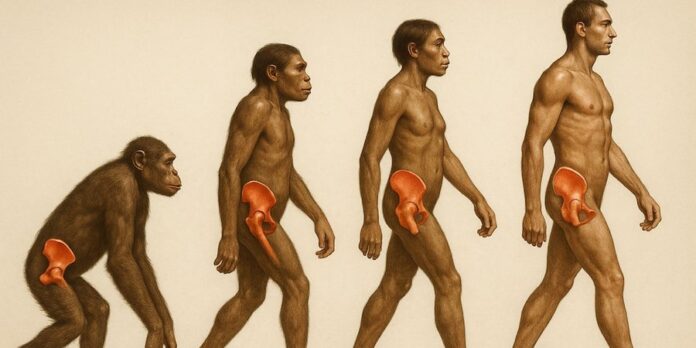 La pelvis, considerada la piedra angular de la marcha erguida, experimentó una transformación radical a lo largo de millones de años. En los simios africanos —como chimpancés, bonobos y gorilas— los huesos ilíacos son altos, estrechos y orientados de adelante hacia atrás, mientras que en los humanos estos huesos se han girado hacia los lados y forman una estructura ensanchada.