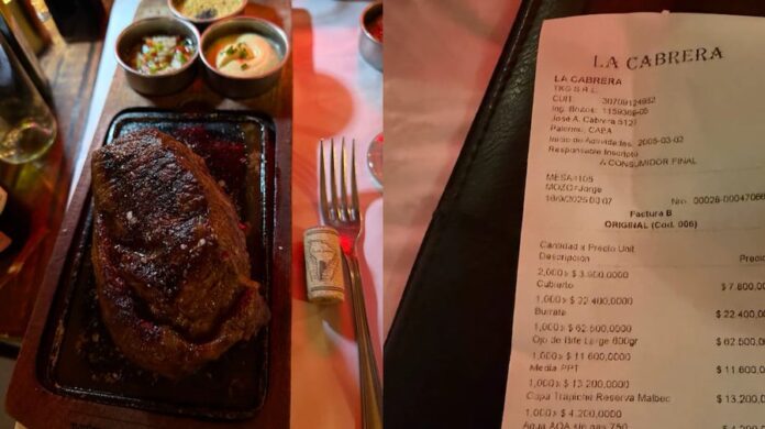 Luego, como plato principal optaron por un ojo de bife large de 600 gramos, con un costo de $62.500. Además, para tomar, eligieron una copa de vino Trapiche Reserva Malbec y un agua sin gas.