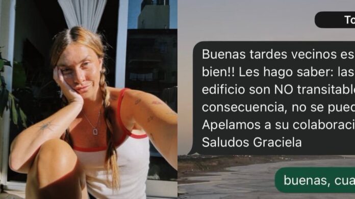 En el posteo, mostró el texto que le llegó: “Buenas tardes vecinos. ¡Espero que estén muy bien! Les hago saber: las terrazas del edificio NO son transitables, en consecuencia, no se puede ir a tomar sol. Apelamos a su colaboración, gracias. Saludos, Graciela”.