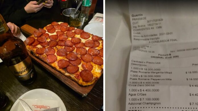 En el ticket que mostró el hombre, se puede ver que, pidió una pizza mitad margarita y mitad de pepperoni, a un costo de $18.000 cada una. Además, agregó un adicional de champiñón por $7.100.