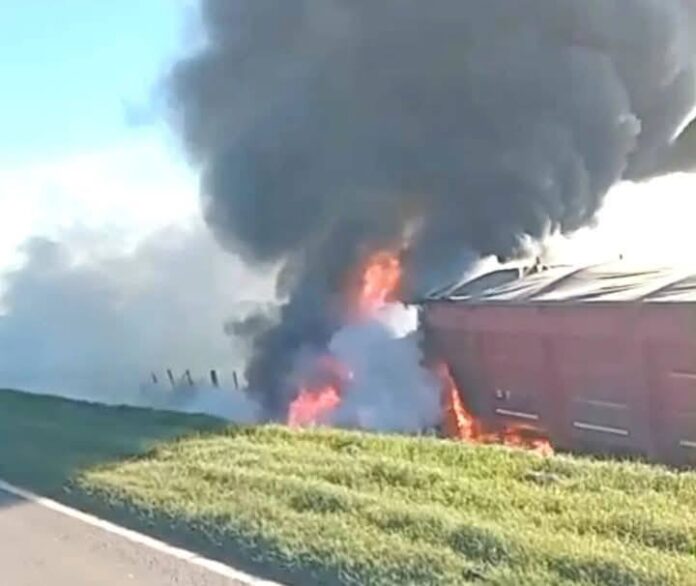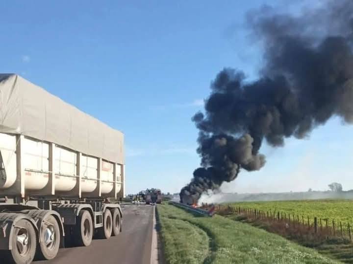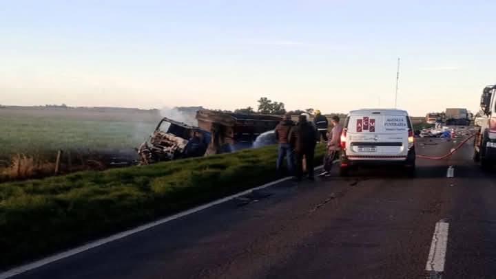 El camión terminó volcado en la cuneta y se incendió en la cabina, aunque el conductor habría alcanzado a salir a tiempo, siendo trasladado para una mejor atención hacia Venado Tuerto.